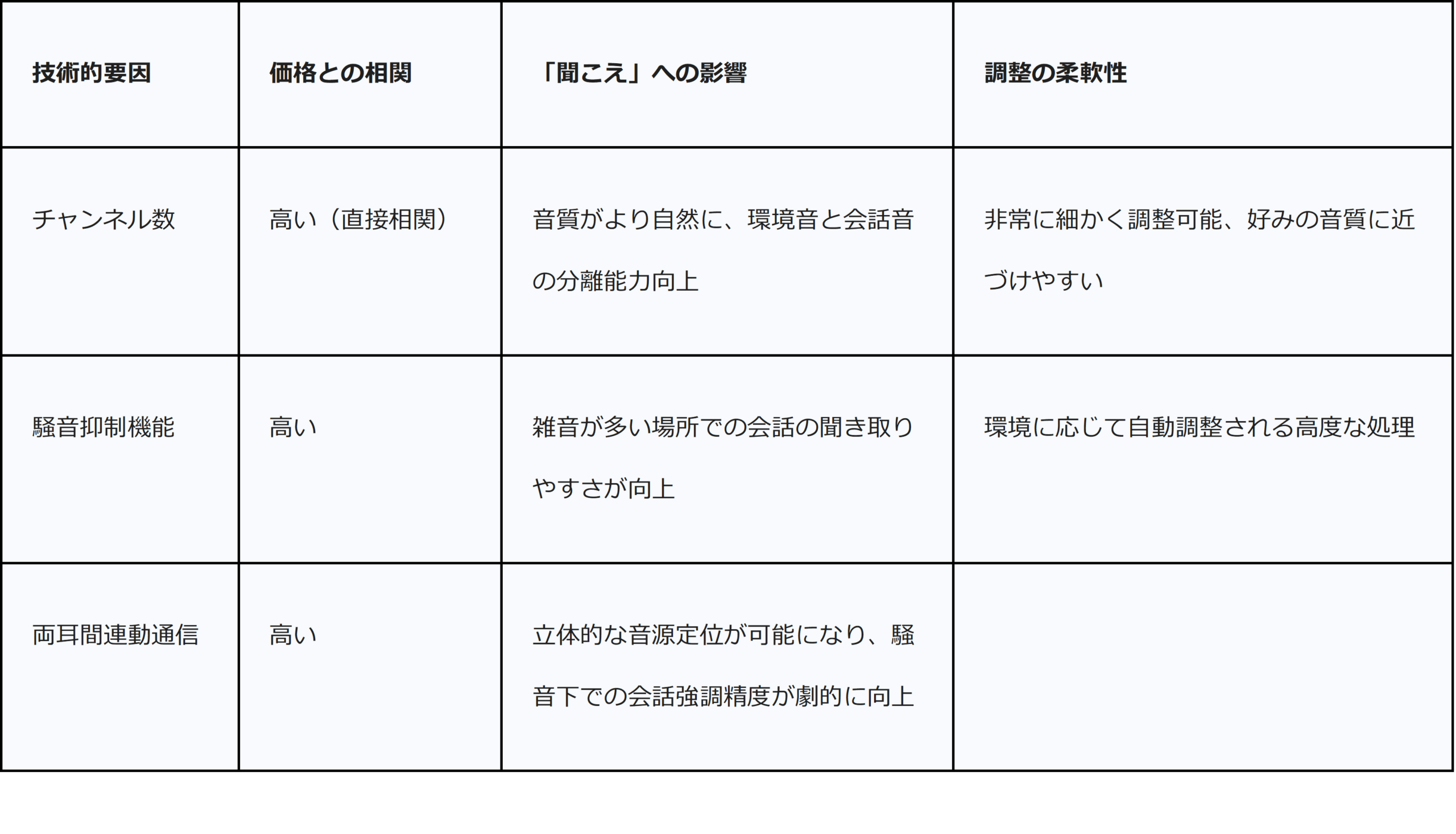 チャンネル数は、補聴器が提供する音響的な「解像度」を示す指標であり、これが高価格帯の主要な技術的根拠となっています。